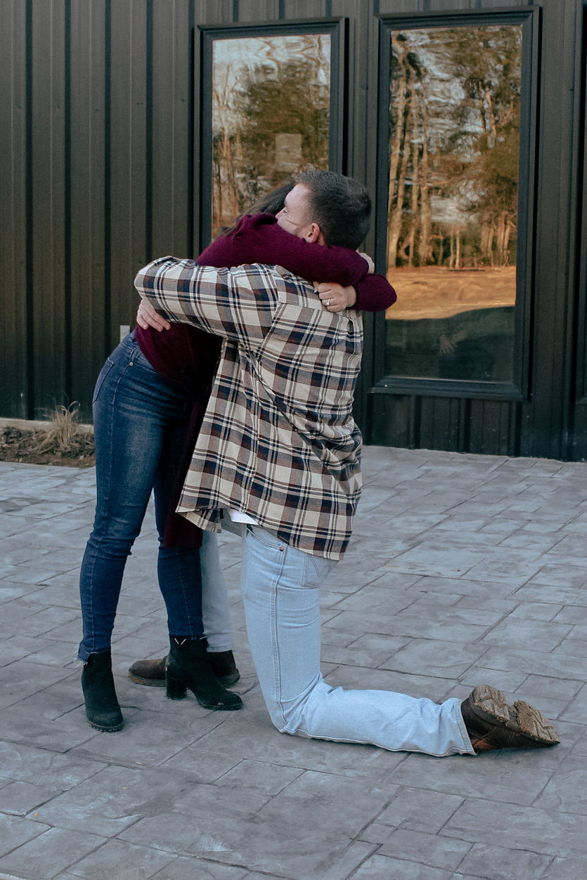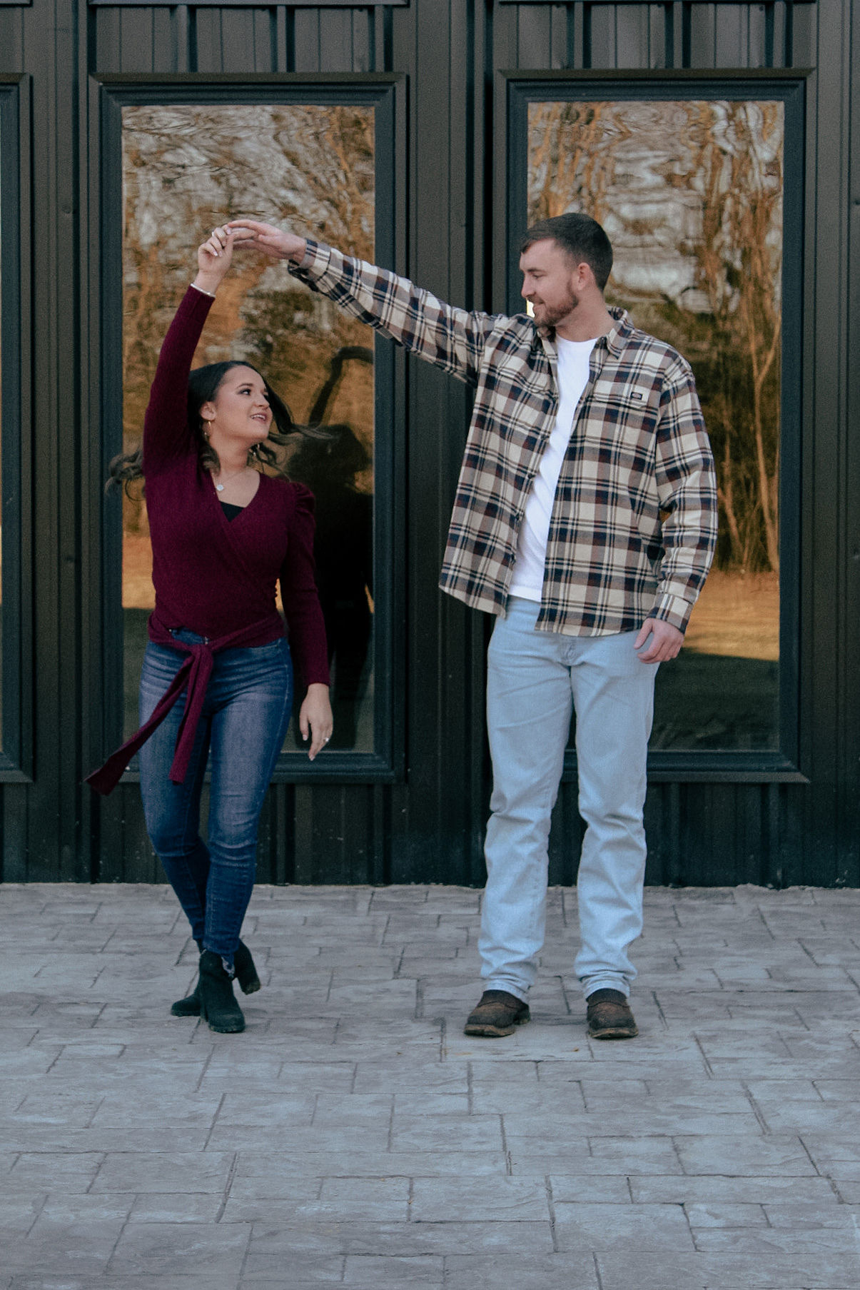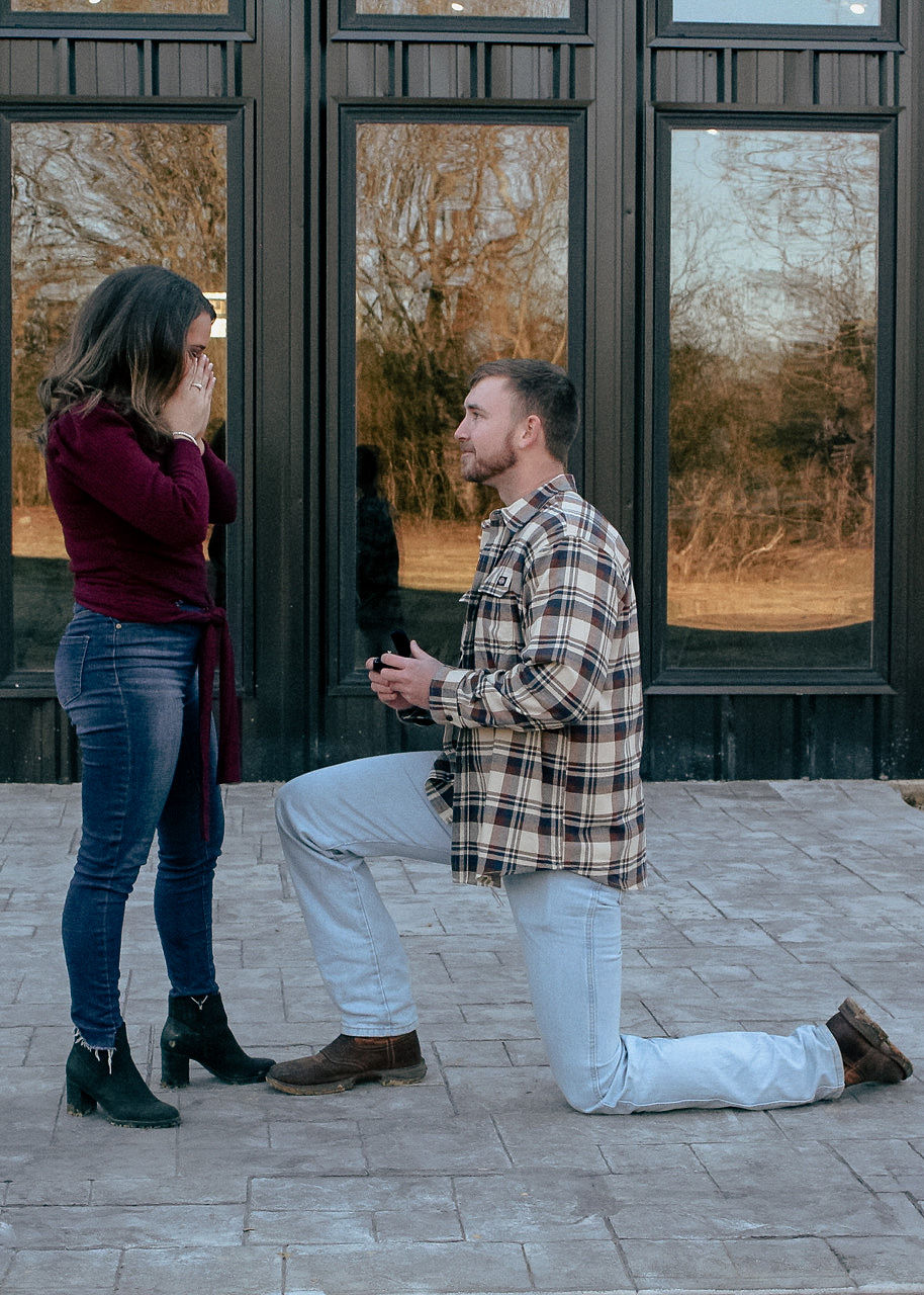We started the session and I could tell they were slowly getting more comfortable in front of the camera. We went to each of the locations on the property that we wanted to and eventually made it to the back of the venue – the last spot. There were giant windows looking into the venue and family members from both sides were hidden inside, so they could be present for the moment. I had Brandon twirl Brooklyn a couple times and then he was ready. He got down on one knee and the rest is history.
